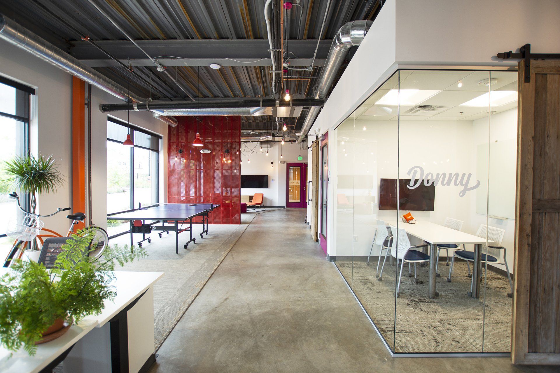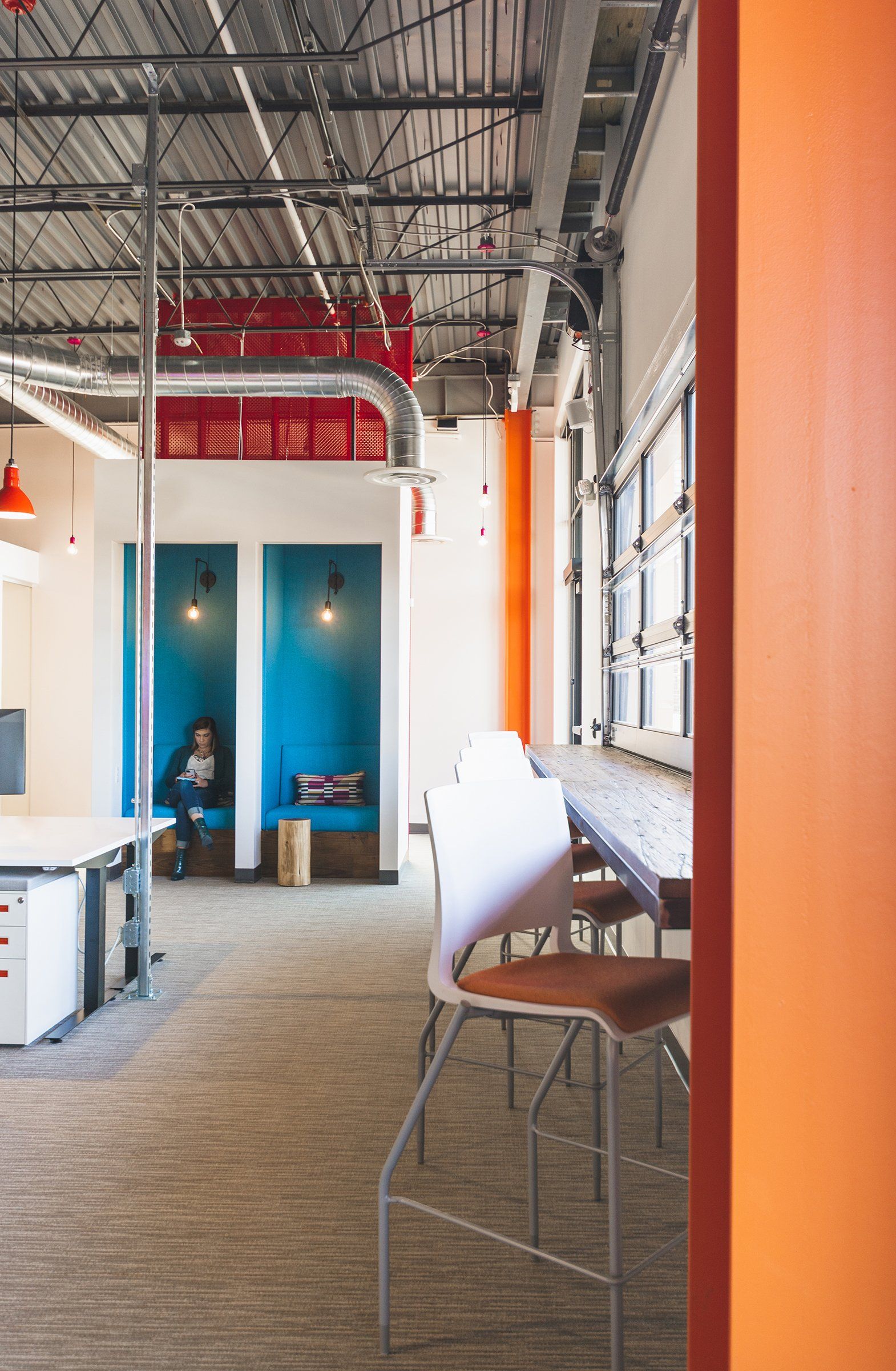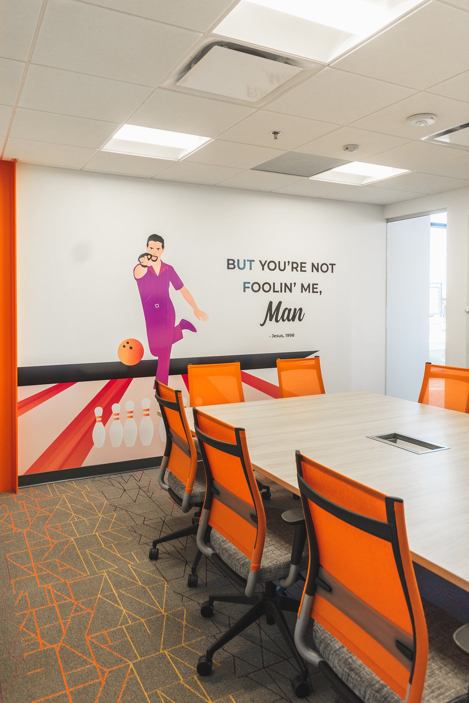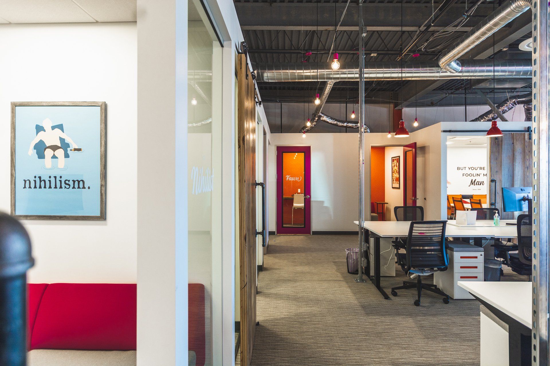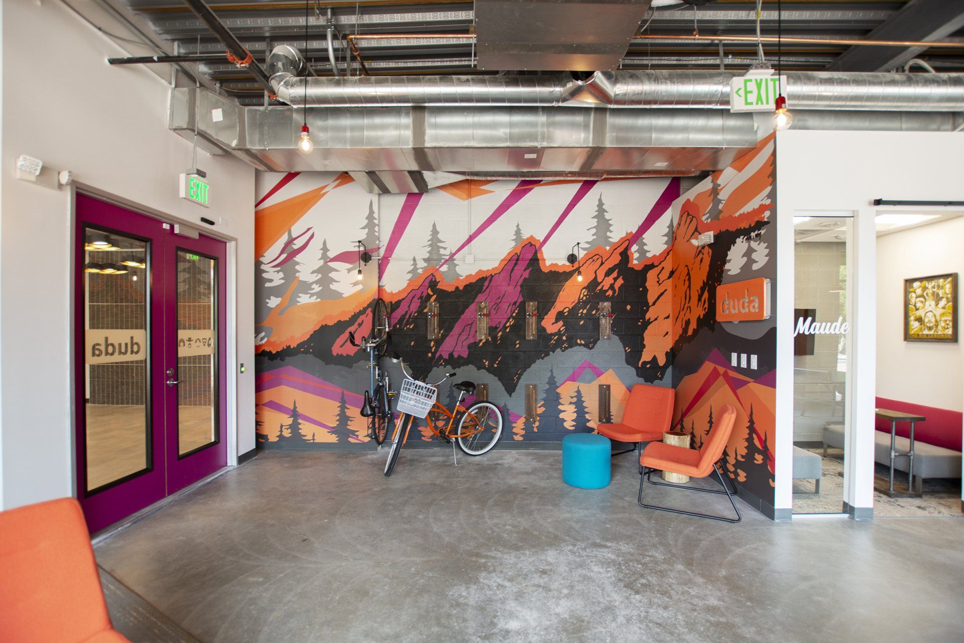 This organization prides themselves on expressing the personality of their company through ‘The Big Lebowski’ and ‘The Dude’, the movie’s main character. Throughout the office you can find rooms named for Lebowski characters and meeting rooms themed for their specific uses. Many reclaimed materials were used in the design for a highly industrial, worn and warm look, such as reclaimed barn wood doors, custom made iron door pulls, painted metal panels and the existing metal rusted deck. The rusted deck was a jumping off point for the use of Duda’s main color in the design, as well as inspiration from the sunset over the Flatirons. The colors of the sunset feature an array of oranges, reds and fuschia that can be found throughout the office. The completed design expresses vibrance through color and humor, which is perfect for conveying the funky culture of this driven company.