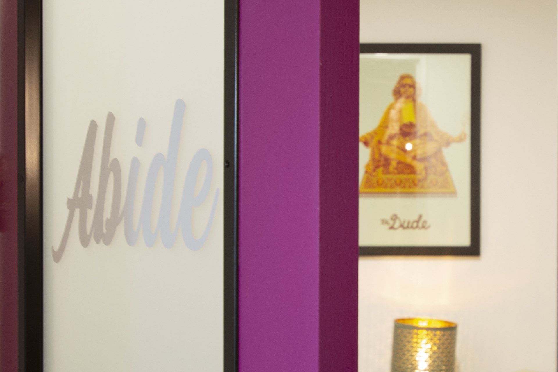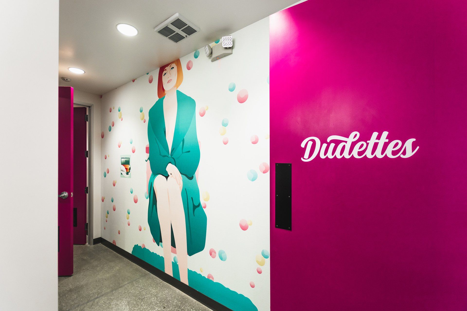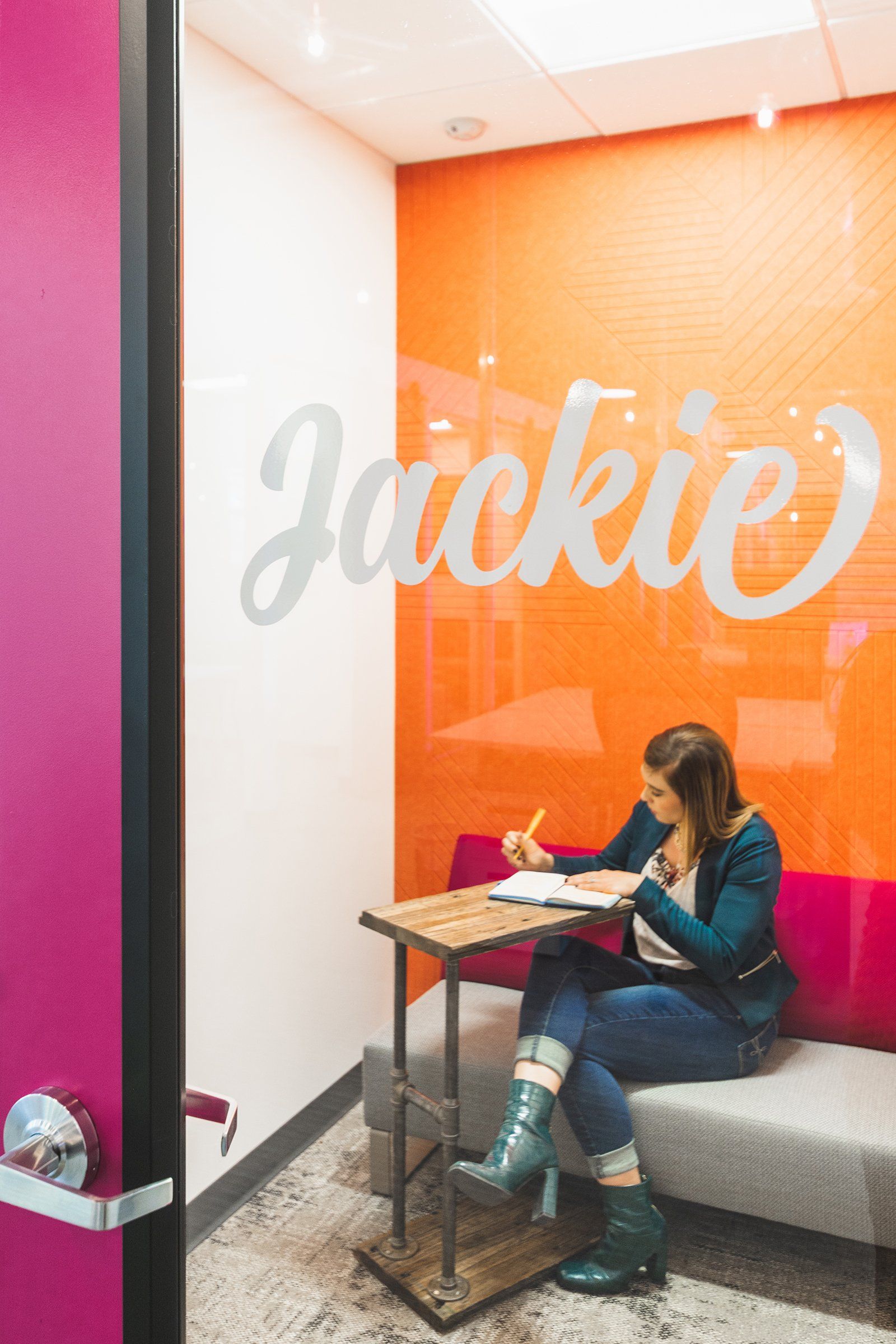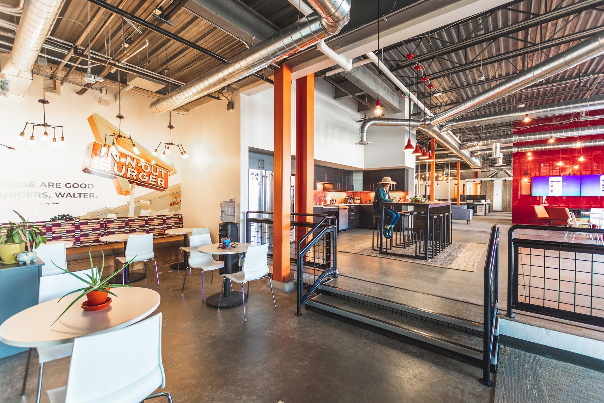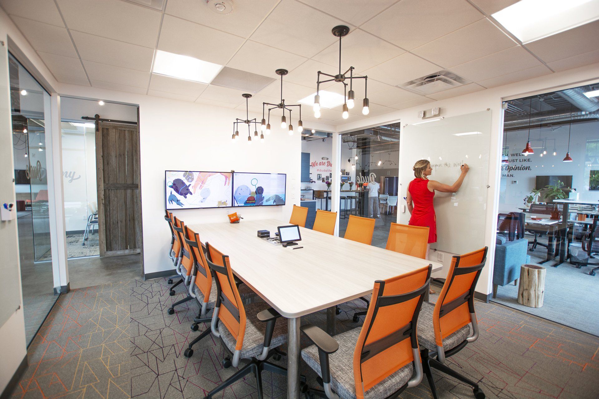 This organization prides themselves on expressing the personality of their company through ‘The Big Lebowski’ and ‘The Dude’, the movie’s main character. Throughout the office you can find rooms named for Lebowski characters and meeting rooms themed for their specific uses. Many reclaimed materials were used in the design for a highly industrial, worn and warm look, such as reclaimed barn wood doors, custom made iron door pulls, painted metal panels and the existing metal rusted deck. The rusted deck was a jumping off point for the use of Duda’s main color in the design, as well as inspiration from the sunset over the Flatirons. The colors of the sunset feature an array of oranges, reds and fuschia that can be found throughout the office. The completed design expresses vibrance through color and humor, which is perfect for conveying the funky culture of this driven company.