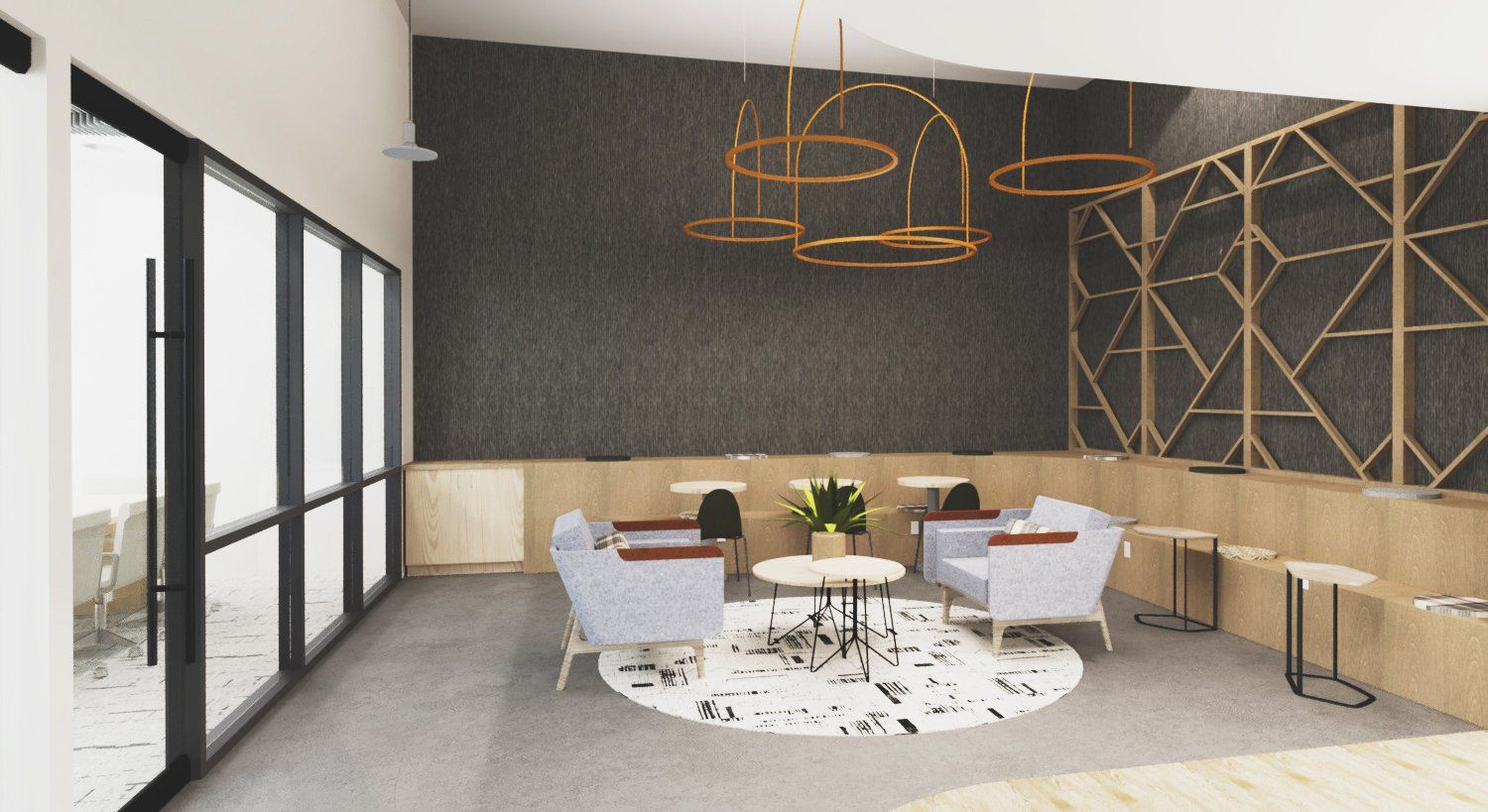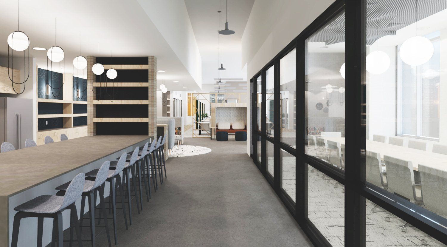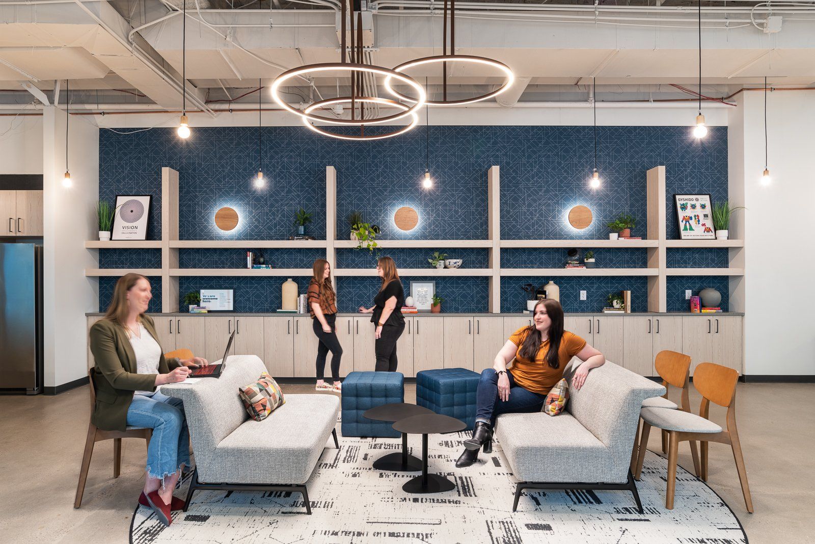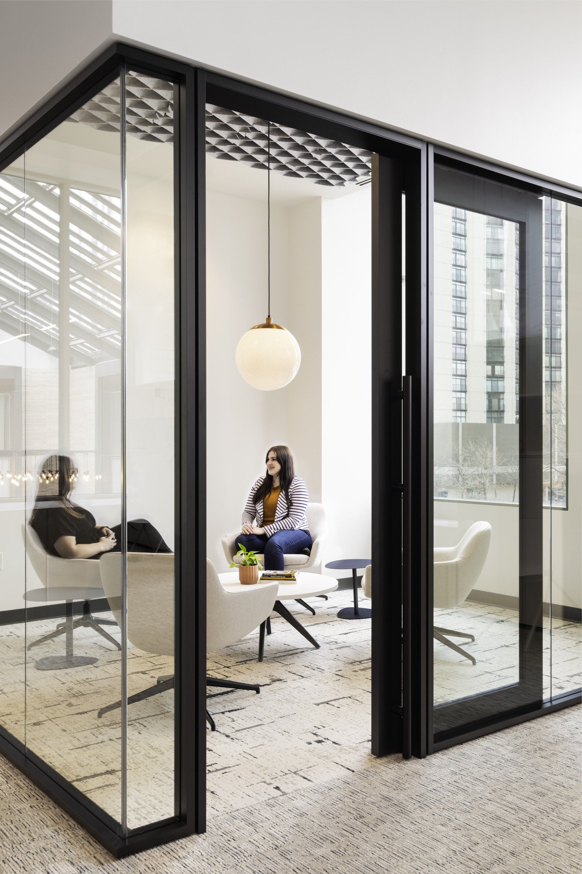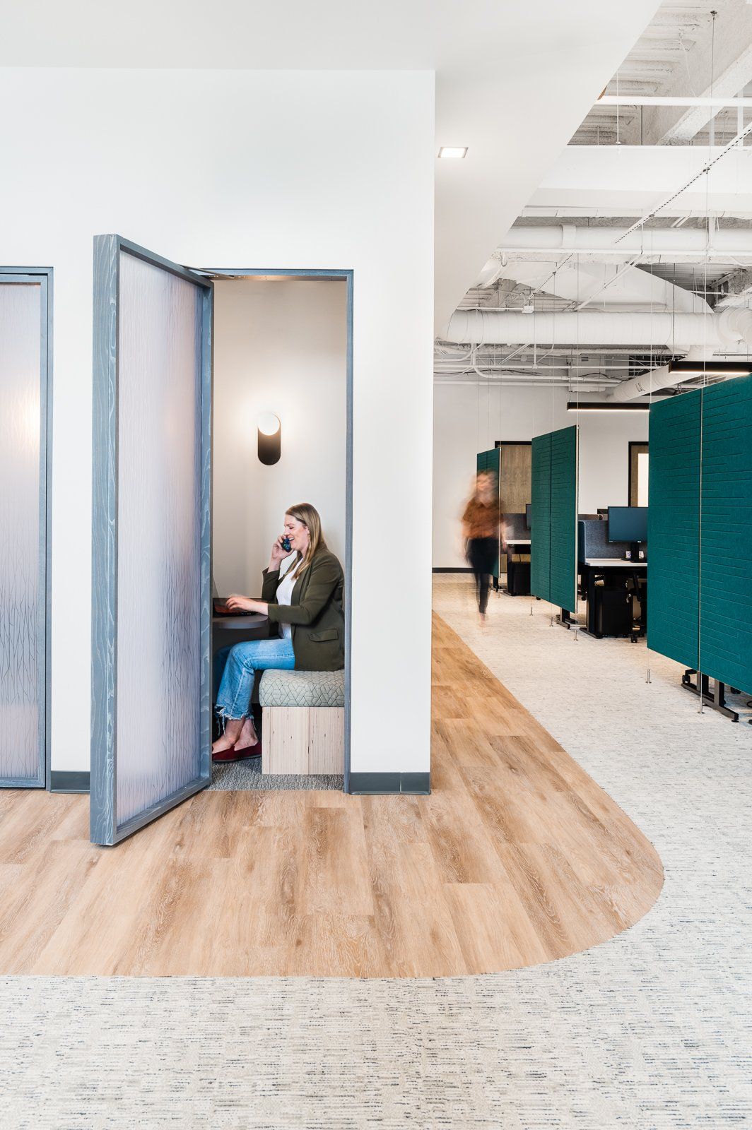 A vacant space with incredible natural light and 15-foot-high white concrete ceilings was the perfect canvas to create an office space that would not only provide a large amenity space to entertain but would also meet their functional day-to-day needs. The design of the space fits perfectly into the building shell with a large lounge and breakroom at the entry to accommodate large all-hands meetings while team workstations, working lounge areas, phone rooms and huddle rooms are located towards the center and back of the space. The back of the office also happens to be where natural light filters in on all three sides, further enhancing the bright work area and helping employees to focus and enjoy their day. The design is fresh and organic with subtle curves and forms on the ceiling and floor, bright walls and finishes to enhance the natural light, along with pops of natural colors like terra cotta, navy blue, sage green and ash wood. With such an open office, acoustics were given ample consideration for separate of the all-hands meetings and the workstations.