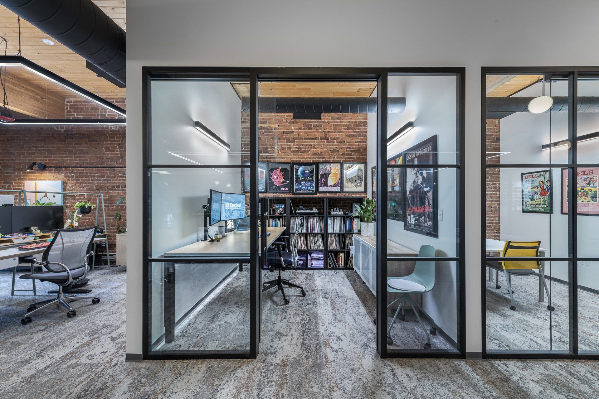 Like many clients, Kestrel Design Group required more space for flexibility to grow the design team while also creating an environment to host events and gatherings. The studio space needed to inspire creativity, invite collaboration and drive innovative thought. The historic Market Center building created a backdrop of character and warmth through enclosed brick walls, timber beams and deck, and original floor to ceiling windows nestled in to allow natural light to filter deeper into the studio space.