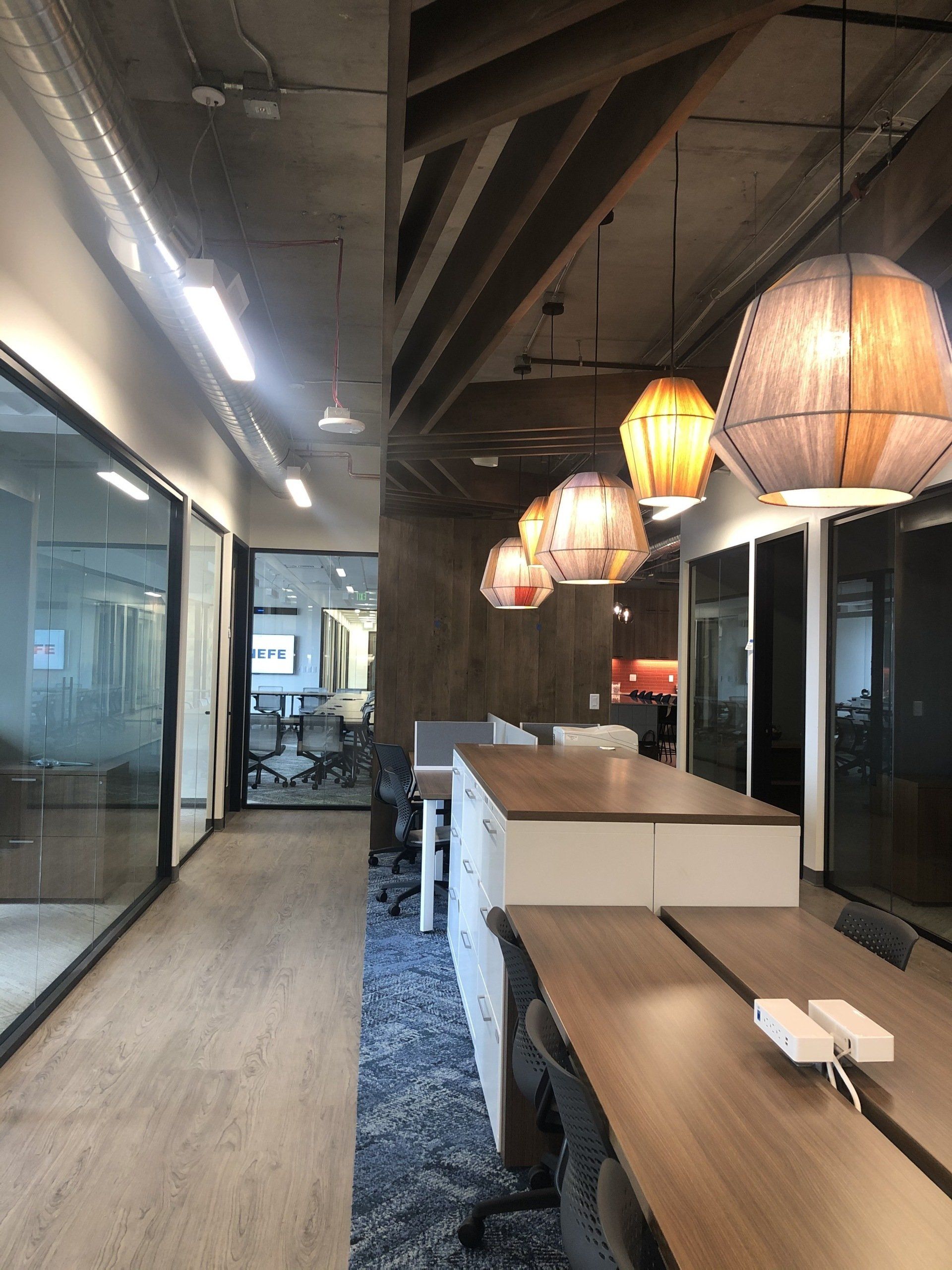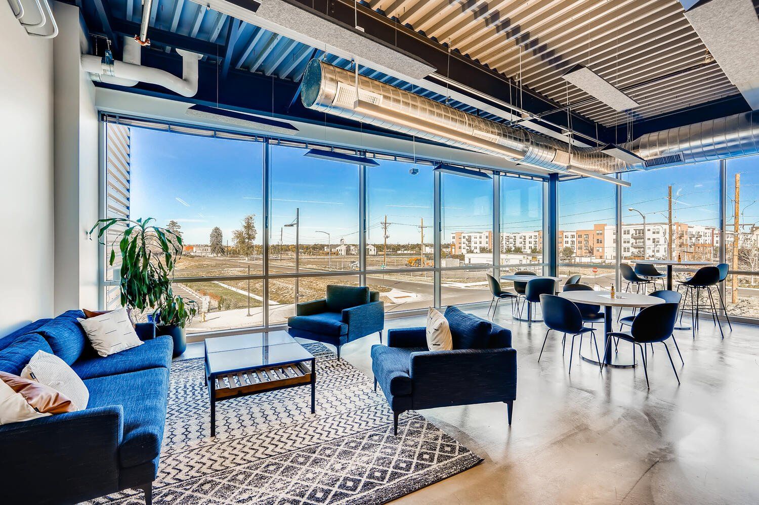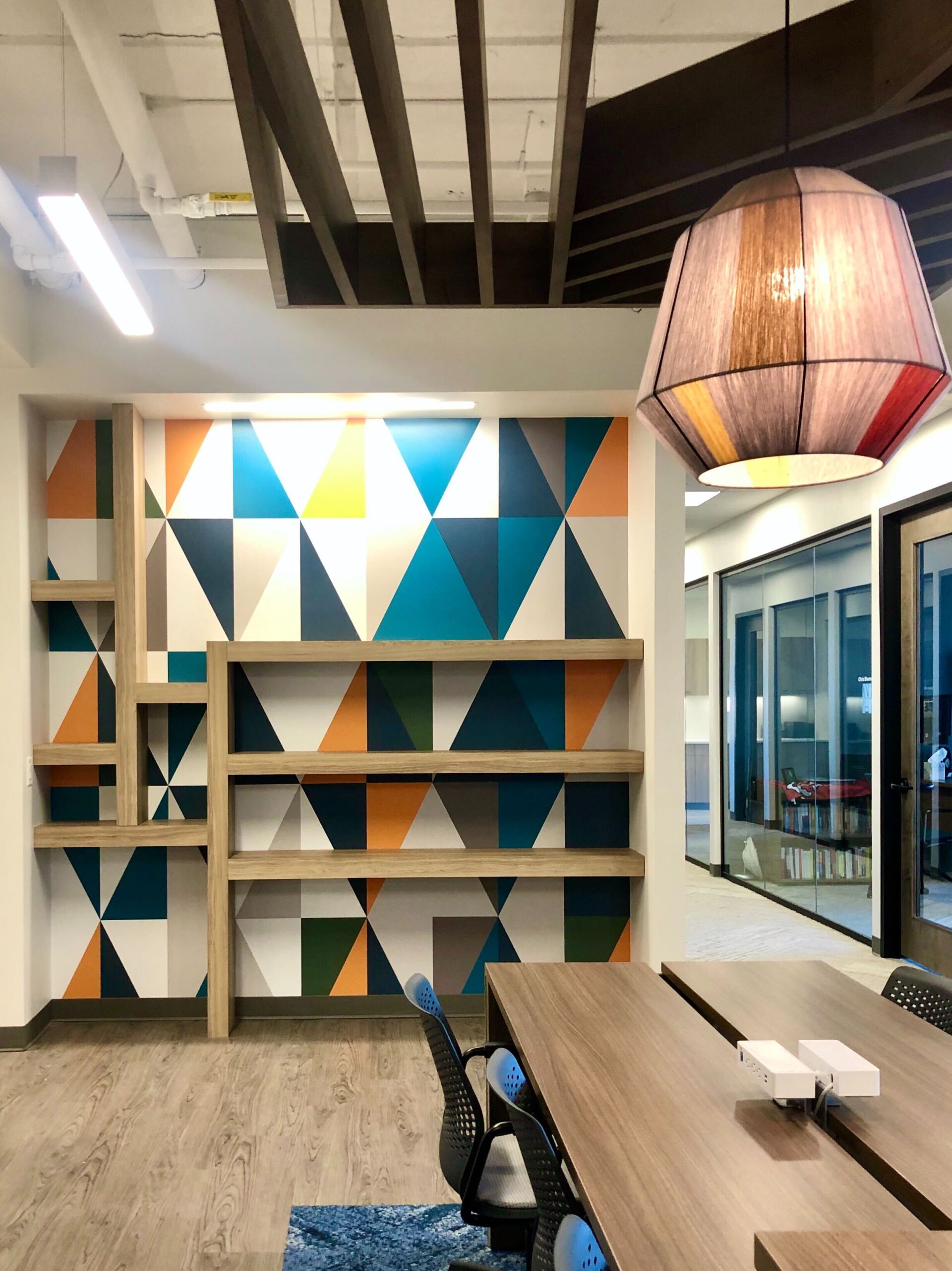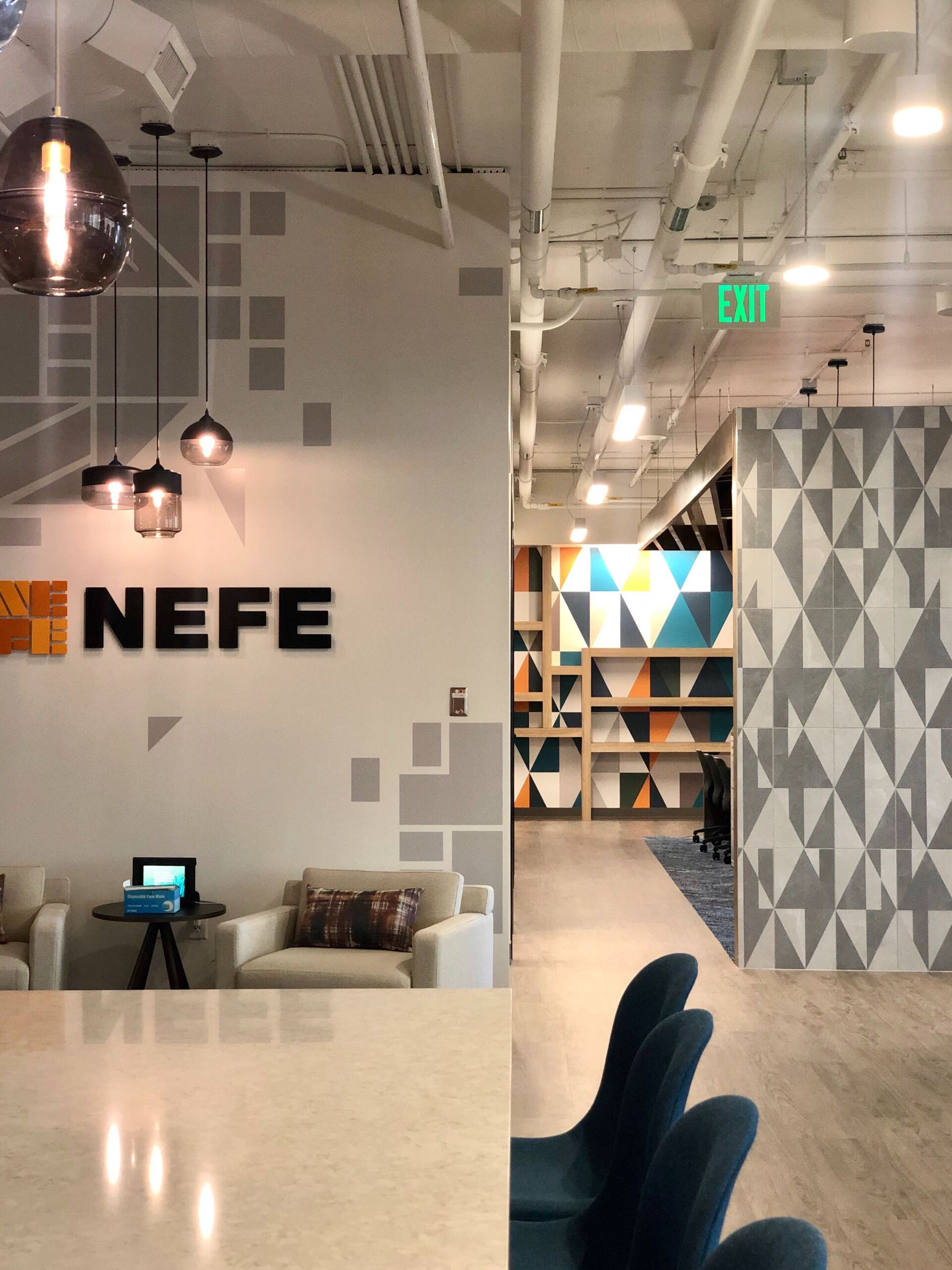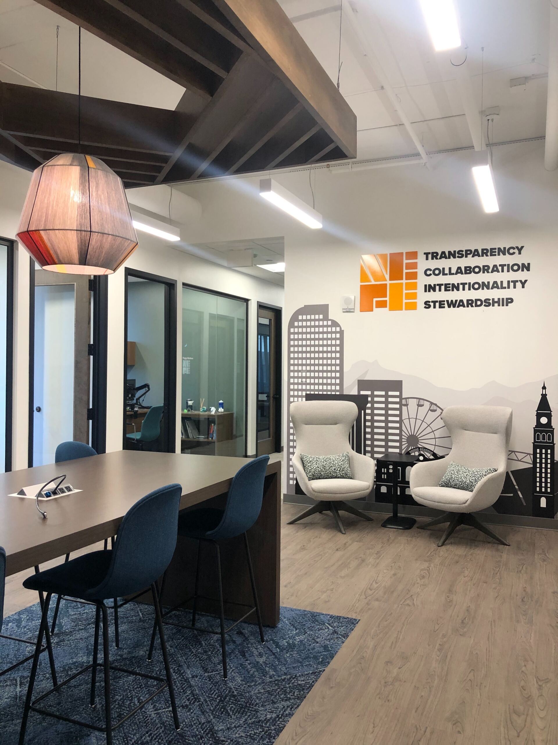 The National Endowment for Financial Education was seeking to create a unique, fun and creative new space to reflect the new direction and brand of the company. They wanted to depart from their previous corporate standards to create a new look and feel that both their employees and visitors could enjoy and be proud of. With a design emphasized by literal and metaphorical transparency, natural light was able to flow inwards through all of the private office full glass fronts from the exterior glazing, while bright new branding colors grounded collaboration spaces for marketing and creative team members. Not only are the collaboration spaces grounded by blues and greens, but fun branding shapes borrowed from the new logo adorn open huddle and lounge spaces to truly bring the concept of NEFE through all areas of the new work space.