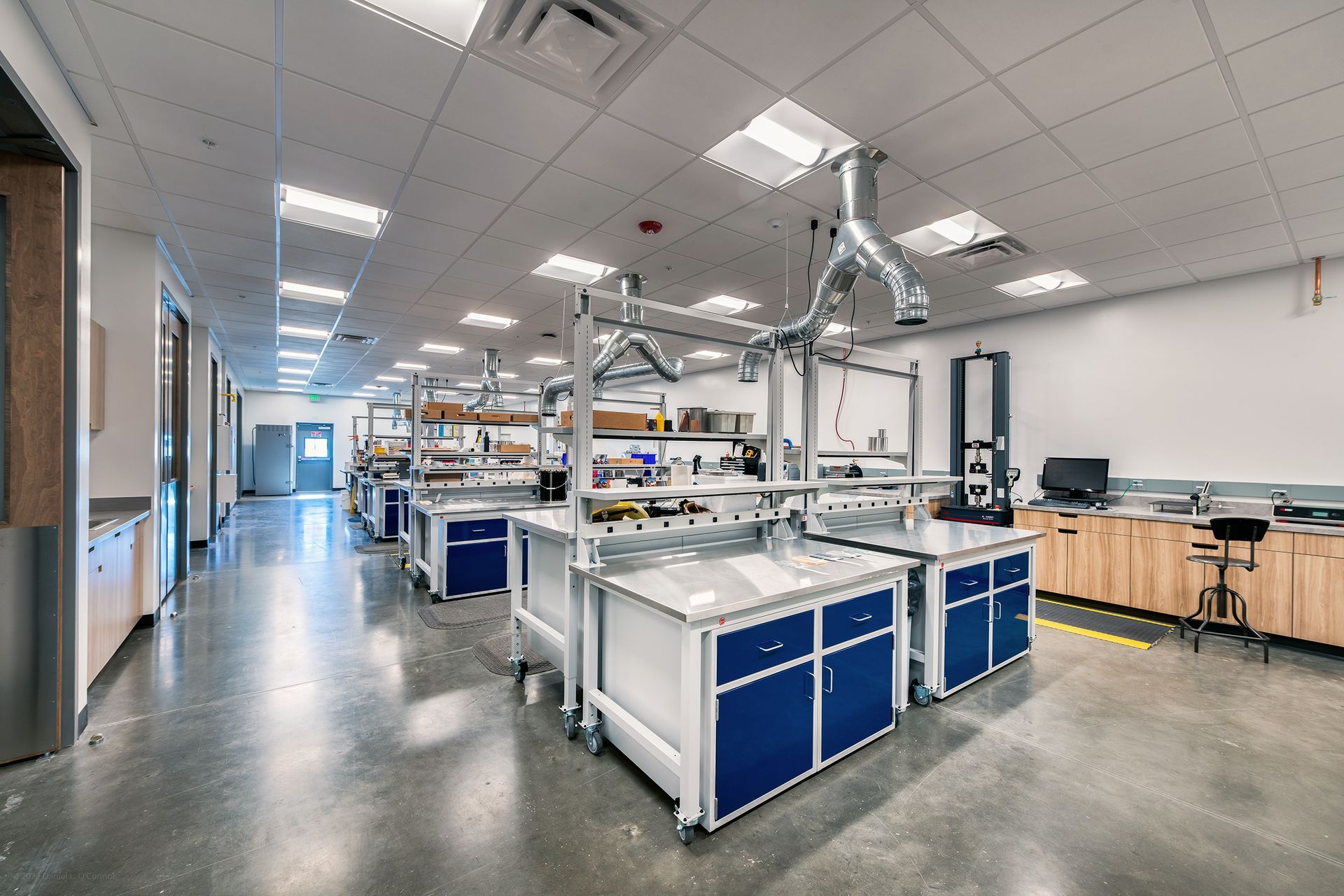 The design team partnered with Sashco in order to create a design that focused heavily on small details and specific needs, from product labs to creative marketing spaces, to production space, all while maintaining the brand and unifying each of the different manufacturing processes across the entire 128,000 square foot facility. Sashco's idea of “One Company” was the unique concept at all junctions that led to the decisions that resulted in the final design: this meant the unification of their production process, lab process creation of products and their employees who work within the office. The process of design started with in-depth programming and space planning sessions that were done virtually with Sashco through the pandemic to ensure that each of their adjacencies, future needs, growth and company goals would be met. The result is a design that captures so many elements of Sashco’s company history, a story of its people and a truly fun environment for everyone to work.