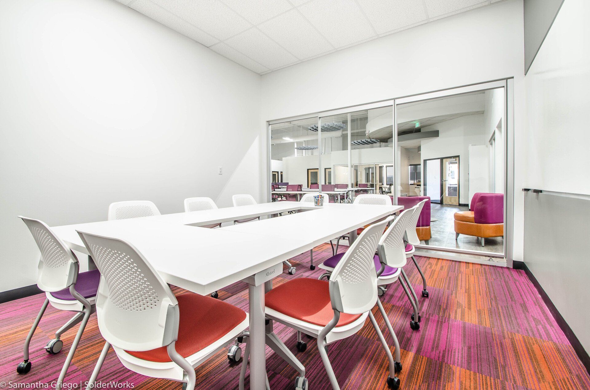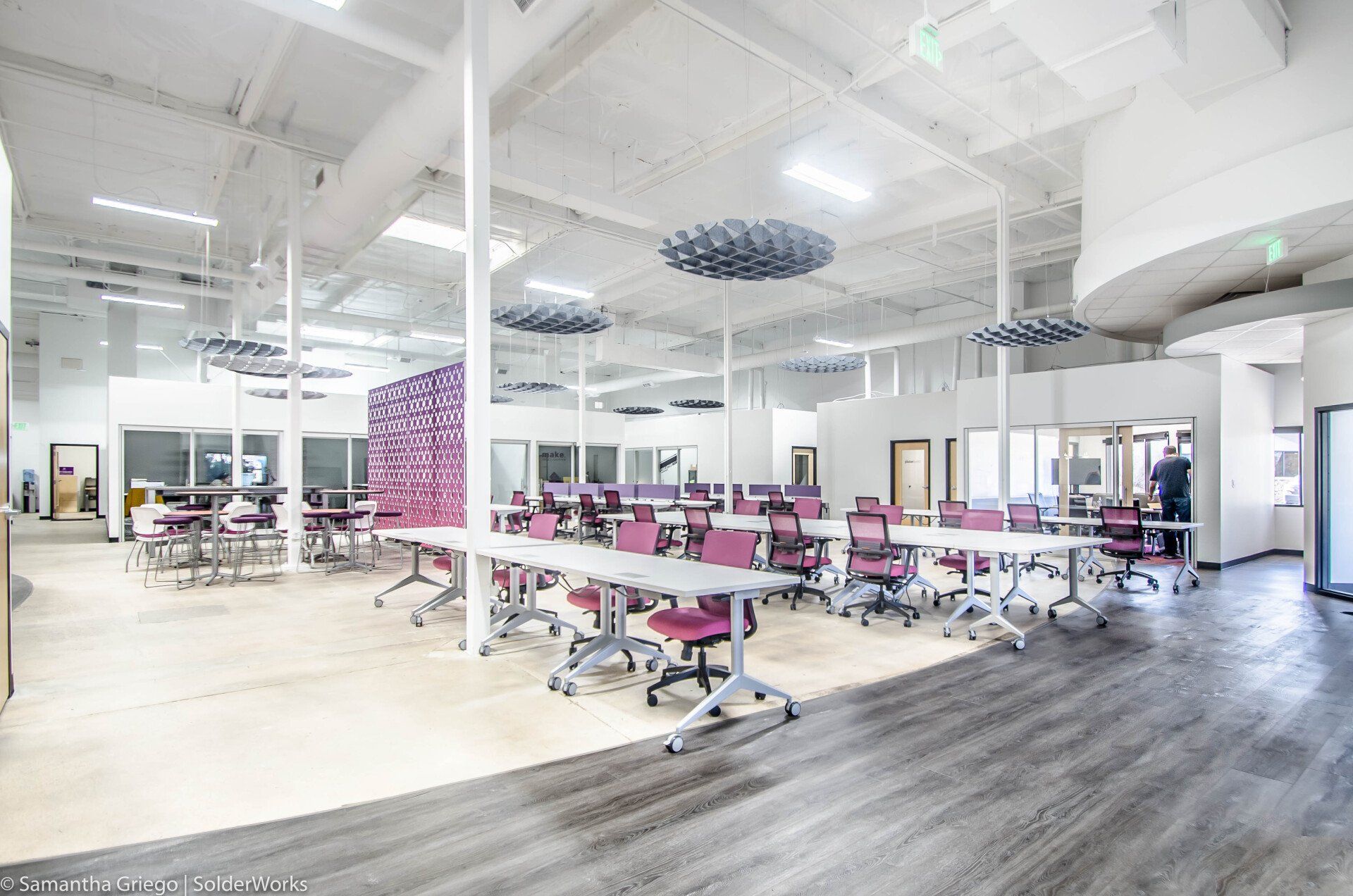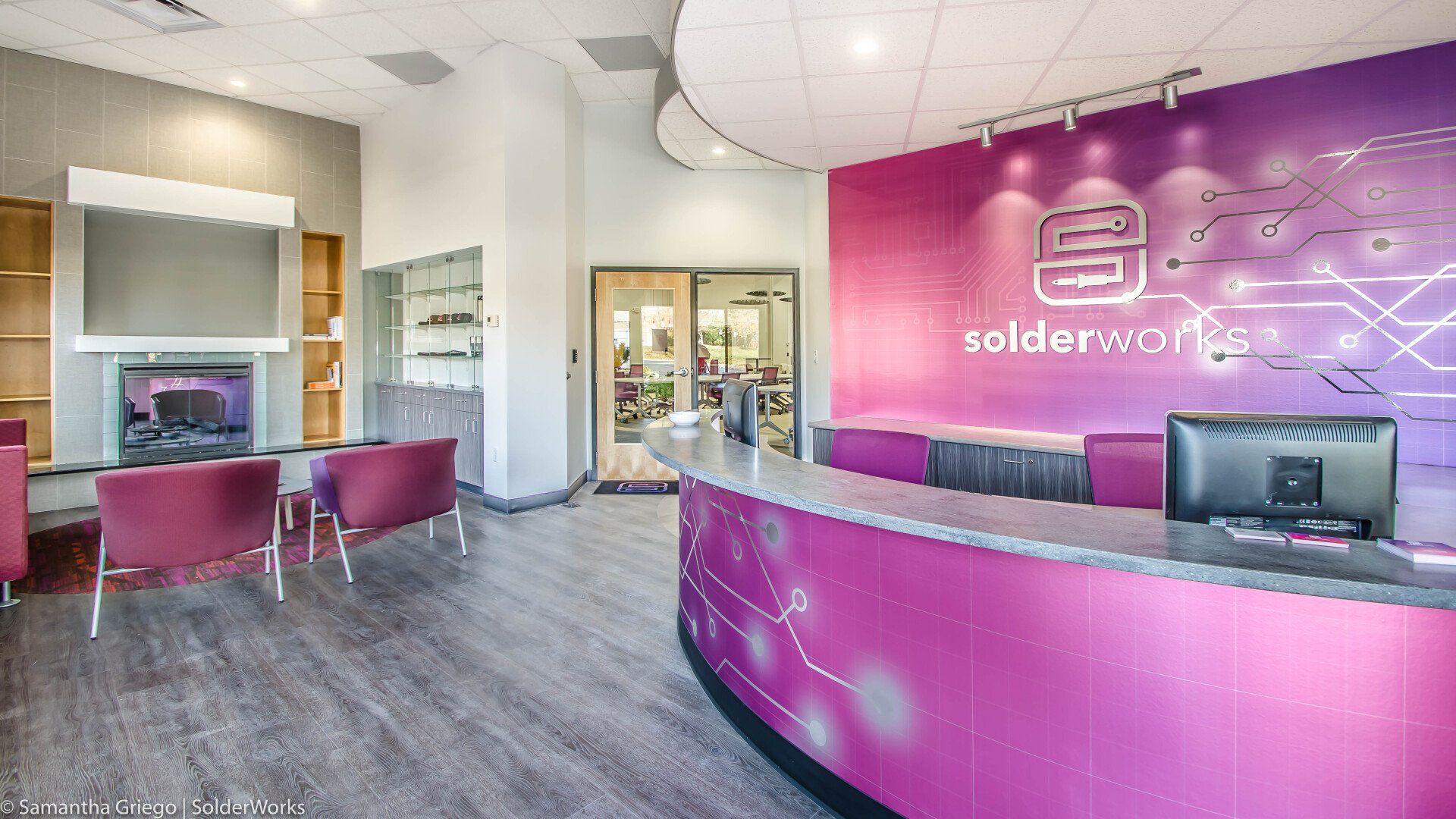 While co-working spaces are abundant in the Denver metro area, our client saw a need to fill the co-making space void. SolderWorks provides not only workstations for individuals and offices for start-up companies, but rooms for printing, cutting, soldering, and working. The client held a competition for the brand logo and the selected winner took their cue from the color of heated solder, fuchsia and purple. These colors spilled over to the public spaces along with an orange accent while the offices remained neutral for personal branding. In addition to branding with the logo colors, the space was designed with a heavy tech aesthetic to highlight the type of work being done in the space.